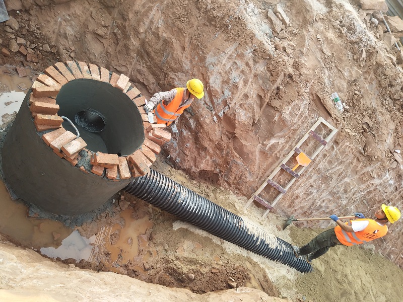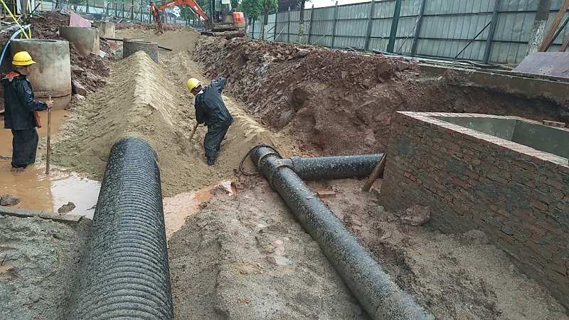 公司承接了百聯(lián)購物公園的小市政項目,項目主要由DN300球墨鑄鐵給水管道、DN600HDPE雙壁波紋雨水管道、DN400雙壁波紋污水管道、DN100PE中水管道及各種閥門井及檢查井組成,管道設(shè)計結(jié)構(gòu)錯綜復雜、排列緊密,污水管道設(shè)計埋深甚至達到4~5米,整個項目又均為風化巖地貌,施工難度很大。加之工期正值端午前后,雨水充沛,大量暴雨也為施工帶來了不小的難度。施工期間,先后遇到了如管道作業(yè)面狹小四排管道施工無法同時推進、井面設(shè)計標高與園林地面標高無法統(tǒng)一、深基坑土方開挖及支護、甲方開業(yè)搶進度等一系列問題。但是,在我們星澤公司項目部全體同仁的共同努力下,以發(fā)揚不怕苦、不怕累的艱苦奮斗的精神,本著客戶第一、質(zhì)量第一的理念,在保證安全和工期的前期下,順利完成施工任務(wù),項目也得到了業(yè)主及總包的充分肯定。