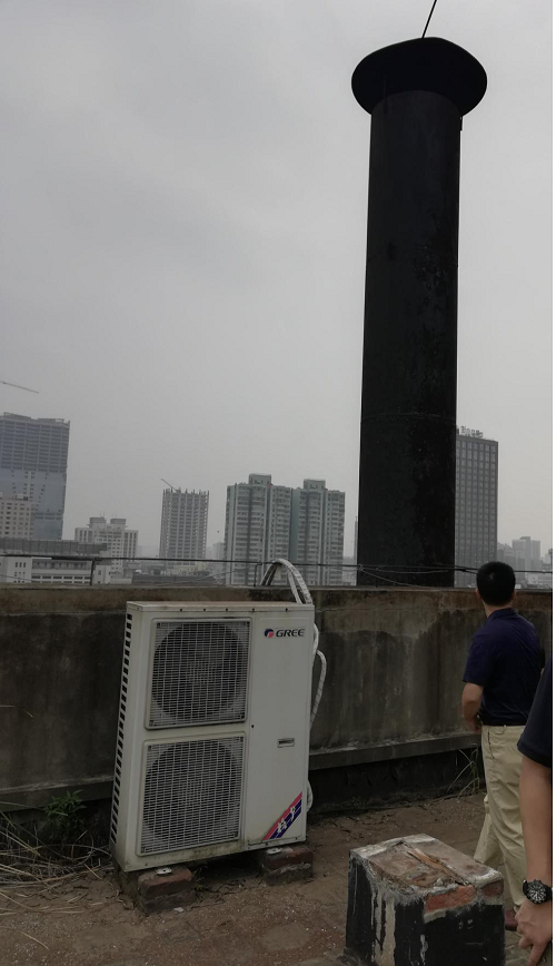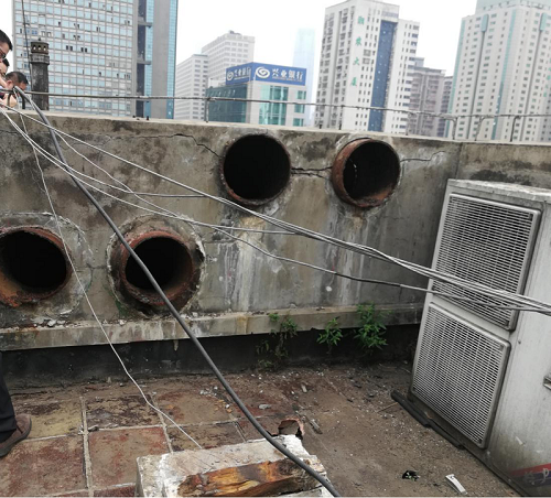 原煙囪(焊接鋼管),管徑約為900mm。沿小區(qū)2棟北外墻靠東豎向安裝,從負(fù)一層一直到樓頂,總高度約36米。