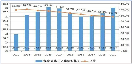 國(guó)家能源發(fā)展十三五規(guī)劃:到2020年,能源消耗總量控制在50億噸標(biāo)準(zhǔn)煤以?xún)?nèi)。2019年全國(guó)煤炭消費(fèi)量約28.04億噸標(biāo)準(zhǔn)煤,煤炭消費(fèi)量占能源消費(fèi)總量的57.7%。