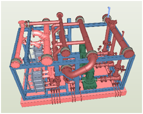 2) 按照廠家提供的機(jī)組、水泵等設(shè)備和閥門(mén)、過(guò)濾器等附件的尺寸大樣圖, 進(jìn)行1:1精確建族,使整個(gè)機(jī)房?jī)?nèi)的管道、設(shè)備、構(gòu)件等全部遵照實(shí)際尺寸比例,然后綜合考慮各方因素對(duì)機(jī)房模型調(diào)整優(yōu)化,待機(jī)房方案例如排水溝位置、設(shè)備布置方案、管道排布走向確定后,對(duì)管道進(jìn)行合理分段劃分,并進(jìn)行BIM建模;