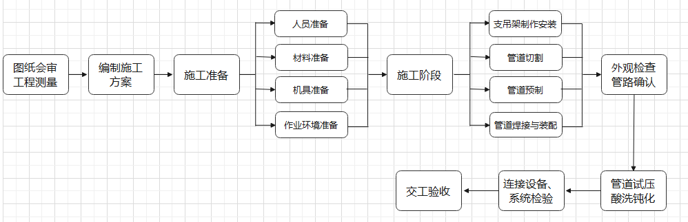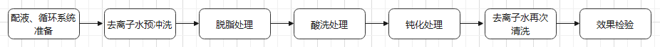 為保證潔凈管道系統(tǒng)內(nèi)表面的潔凈程度,使所輸送的潔凈介質(zhì)不與管道內(nèi)表面的金屬離子發(fā)生化學(xué)反應(yīng),不污染介質(zhì),以保證產(chǎn)品質(zhì)量,必須對管道內(nèi)表面進行脫脂、酸洗、鈍化處理,具體流程如下圖所示。