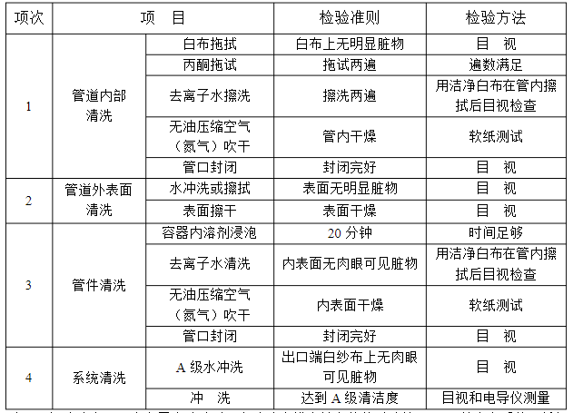 注:A級清度:用去高子水沖洗時,在清洗水排出端安裝能過濾掉50um以上雜質(zhì)的不銹鋼濾網(wǎng),沖洗5~10分鐘,目視濾網(wǎng)上或紗布上無異物。