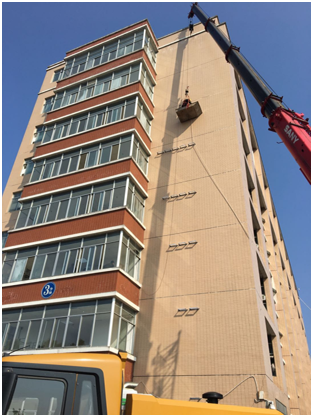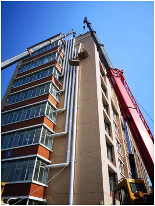 4、本工程的工作難點是外墻風(fēng)管的施工安裝,外墻管道最高處有35m高,因此,所有外墻管道、支架需借助吊車輔助施工。